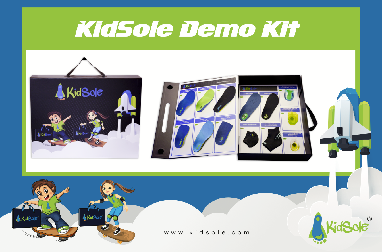 Demo Kits ship in a custom display case that opens flat to help demonstrate how KidSole products address your patient’s foot issues. Demo Kits are provided as a professional courtesy and all we ask is that you pay the $24.99 for shipping.